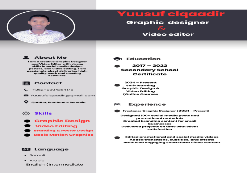 Waxan ahay graphic designer iyo video editer porofeshnal ah Waxan kusameya Photoshop canva editingkana Capcut Gacmo furan iyo wax qabad tayo sare leh kusodhowada